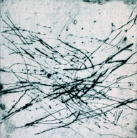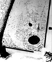 Gietzstudied art-pedagogics and graphic-design. Since 1974 he works as painter and graphic artist as well as an art-teacher in Berlin. He is regually exhibiting abroad and in Germany and is represented in public and private collections. In his artistic work - in particular landscapes and cities - he often is influenced by his impressions and his experinces (especially during his journeys). In his multifarious artwork he is always emphatizing social problems and takes a stand against war, violence and destruction. Not only is he showing his etchings, but we can also discover a rarity in this exhibition: A woodcut (2,5 x 1,5 m) which was printed with a bulldozer. Sabine Maier-Wallmannives and works as a painter in Berlin. Since 1999 she exhibits in Berlin and Basel. The graphic platform is the base of her artwork. She is usually working in oil on large scaled canvas. In order to catch the emotions from the distress and grief as well as oppression of the war in Irak, she will utilize 1cm2 details taken out of the photos.They are extremely enlarged and set into a new context. So we are introduced to pictures which are far away from her usual colourful style. Within this cycle they are reduced to black and white. »Durst«, this picture is based on an enlarged detail of two water-containers. Looking at it more closely we can see faces which express one of the subjects of the war in Irak: DURST2 ("THURST"), 2004, 100 x140 cm ................................................................................................................. |