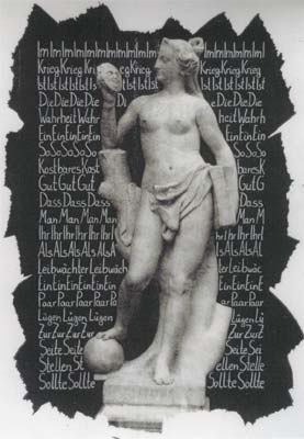 ![]() ................................................................................................................. July 12th - October 3rd 2003 Ilona Engelke, Köln »Coming to Consciousness« Paintings ................................................................................................................. May 11th - June 27th 2003 Arlen Kaschkurjewitsch - Graphics Igor Kaschkurjewitsch - Installlations »DIE SCHREIE DER ERDE« ................................................................................................................. February 21th - April 25th 2003 Marc Dettmann »The Desasters of War - 12 Screenprints on litho film after Goya« Francisco de Goya witnessed the war between the Spanish and the occupying French. In his etching series »Los Desastres de la Guerra« he refrains from depicting events in an anecdotal fashion. In the titles of his prints Goya comments critically on the cruelty of war, its suffering and dehumanising effect on the civilian population, without limiting himself to simply reporting pivotal events. The war he depicts is universal war. What Goya showed openly in the early 19th Century is today vague or completely disguised by censorship. These works have their origins in the first US military attacks against Afghanistan in late October of 2001. Television screens show soldiers' grainy silhouettes, one sees light-green tracer ammunition arching through the night towards an unseen target. As in the last Gulf War the battlefield appears like a meadow filled with fireflies and other nocturnal insects, but without warfare itself. Through the complete exlusion of violence by the night-vision lense an almost abstract spectacle is transmitted into one's living room. I photographed the reports directly from the TV screen. The 35mm camera exaggerated the abstraction even further; shapes emerge from the footage and regain their original horror since direct depiction is far less cruel than abstract images brought to life by one's imagination. Photographs of German suburbia, printed not on photo paper, but on transparent litho film complement the television images. Houses float vaguely in front of the images of warfare merging sender and receiver, or for the latter more correctly consumer of information. War thus enters the living room. Explosions and attack helicopters on semi-transparent film give rise to associations with cancerous tumors on X-ray sheets. The images spread, pulsating through suburban gardens or appearing in front of half-closed curtains. Today war seems clean, »politically correct«, but the titles of Goya's prints are still valid today. They provide the critical commentary to the images, revealing that the ravages of war remain the same throughout the centuries and cannot be blanked out through attempts to edit information. The artist: Marc Dettmann (born 1975 in Hannover) lives and works in Berlin since march 2002. He studied graphic design in Hildesheim and, while on an exchange programme to Spain, painting in Madrid. On graduating he became tutor for printmaking at the University of Applied Science in Hildesheim. Following several group exhibitions thoughout Germany he presents his first solo exhibition at the Anti-War-Museum, Berlin. ................................................................................................................. December 7th 2002 - February 16th 2003 Wolfgang Brecklinghaus »APOKALYPSE - Arbeiten aus Militärschrott / APOCALYPSE - Objects out of military scrap« Materialcollagen und Skulpturen / Collages and sculptures ................................................................................................................. October 6th 2002 - November 24th 2002 Squaw Rose »Russische Spuren - Verlassene Orte« / »Russian Marks - Deserted Places« Photography - Objects Found - Paintings Further information: artinfo-international.com/galerienberlin/peacegallery.htm ................................................................................................................. August 31th 2002 - September 29th 2002 »Paintings and drawings« by artists of the creative workshop of the Hoffnungstaler Anstalten Lobetal ................................................................................................................. June 16th 2002 - August 20th 2002 RUMIKO=H+U (Rumiko Uchida) (Berlin / Japan) »Keine Antwort / No Answer« Paintings ................................................................................................................. April 7th 2002 - May 29th 2002 Maureen Burdock (USA) »Sehnen und Saiten« / »Tendons and Strings« Paintings - Graphic Art - Posters - Sound June 16th 2002 - August 20th 2002 greenburdockmultimedia.com ................................................................................................................. February 28th - March 31st 2002 Sophie Fabien (Berlin / France) »Phytobunker - Synthesis of Peace« Installation + Netart for more about this ongoing project see: phytobunker.de ................................................................................................................. November 11th 2001 - February 3rd 2002 Roswitha Schaab - Sculptures and Prints Artim Gezhilli - Paintings André Willi - Installation ................................................................................................................. |